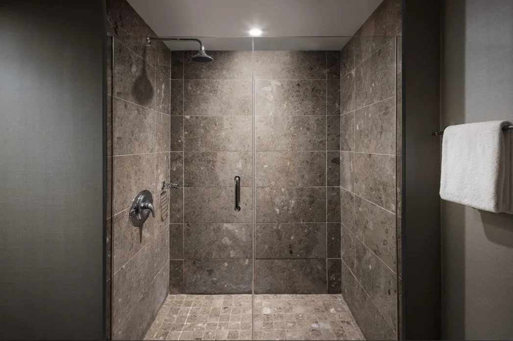 Choose from rooms with king beds, two queens, or spacious suites with separate living areas (no kitchen). All rooms include essentials like a mini-fridge, microwave, and a modern marble bathroom with a rainfall shower.